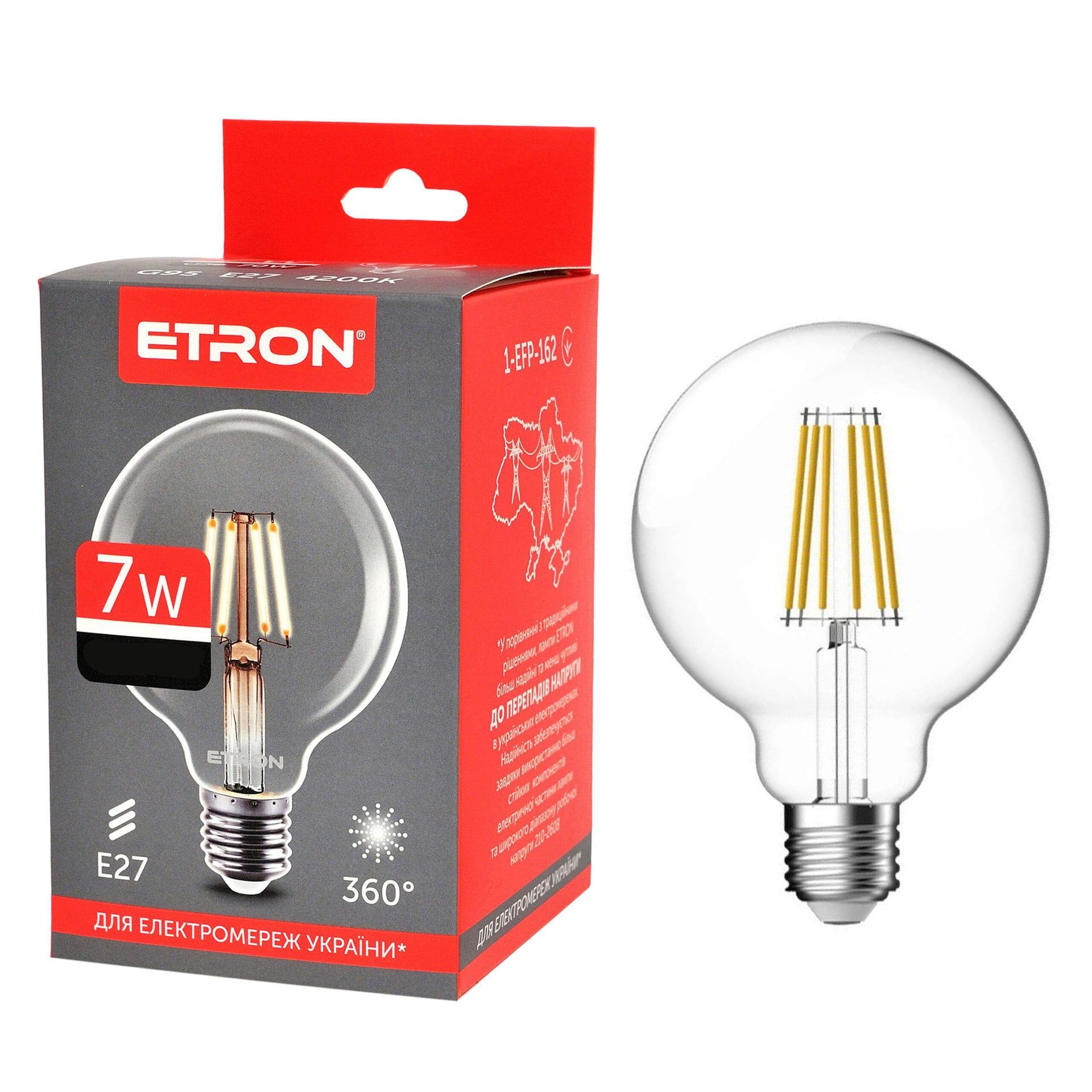 Светодиодная филаментная лампа ETRON Filament G95 7W E27 4200K прозрачная предназначена для внутреннего освещения жилых помещений, а также для использования в осветительных приборах с соответствующей степенью защиты, расположенных вне помещений.