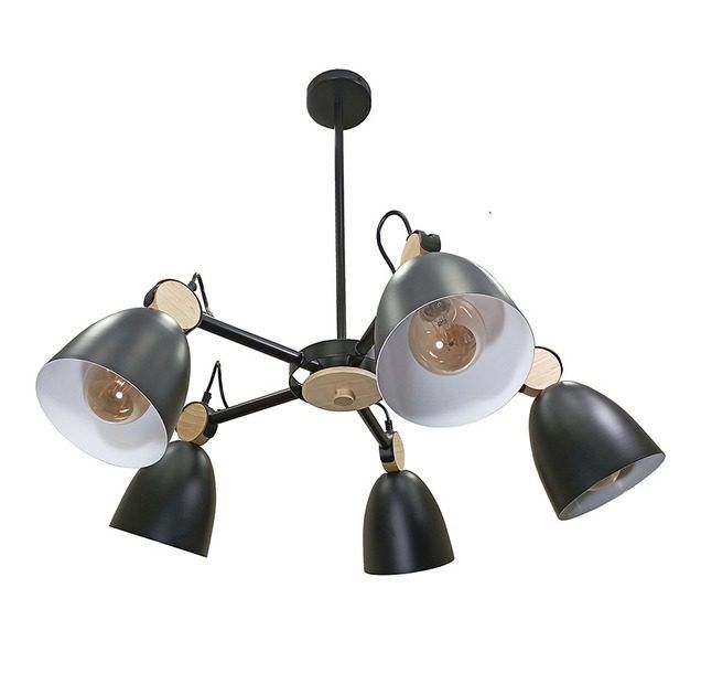 Конструкция состоит из пяти конусообразной формы металлических плафонов и деревянными вставками