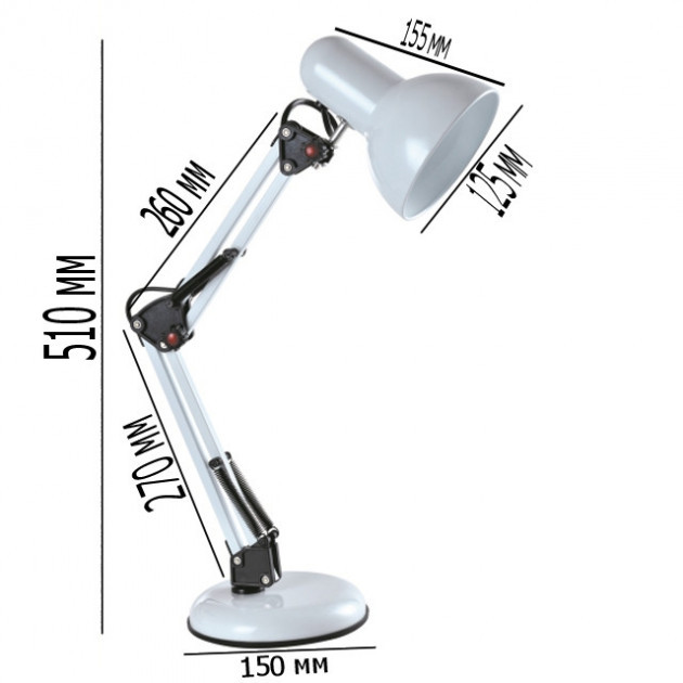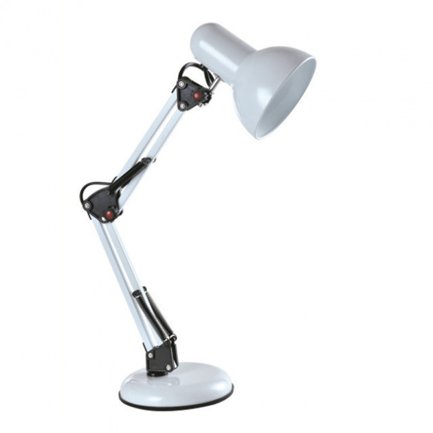 Конструкция состоит из металлического круглого основания, пластиковой ножки и металлического плафона. Ножка оборудована поворотными механизмами, с помощью которых, вы сможете регулировать угол наклона плафона, а соответственно, и площадь освещения.