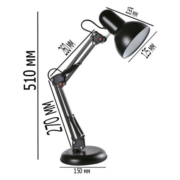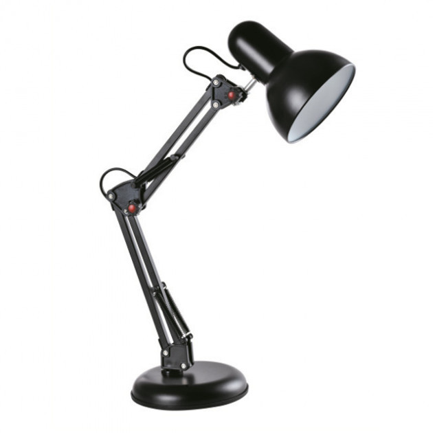 Конструкция состоит из металлического круглого основания, пластиковой ножки и металлического плафона. Ножка оборудована поворотными механизмами, с помощью которых, вы сможете регулировать угол наклона плафона, а соответственно, и площадь освещения.