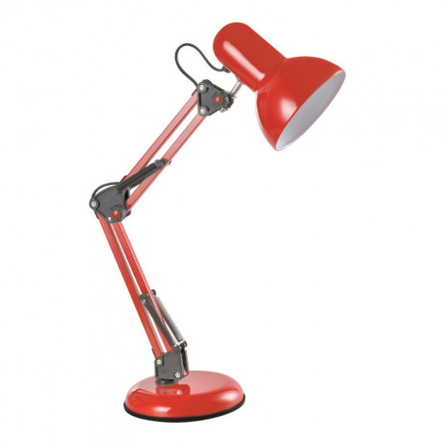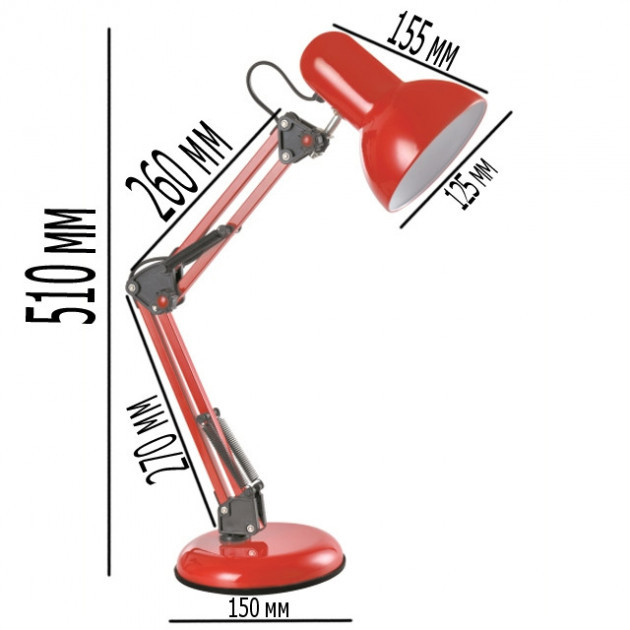 Конструкция состоит из металлического круглого основания, пластиковой ножки и металлического плафона. Ножка оборудована поворотными механизмами, с помощью которых, вы сможете регулировать угол наклона плафона, а соответственно, и площадь освещения.