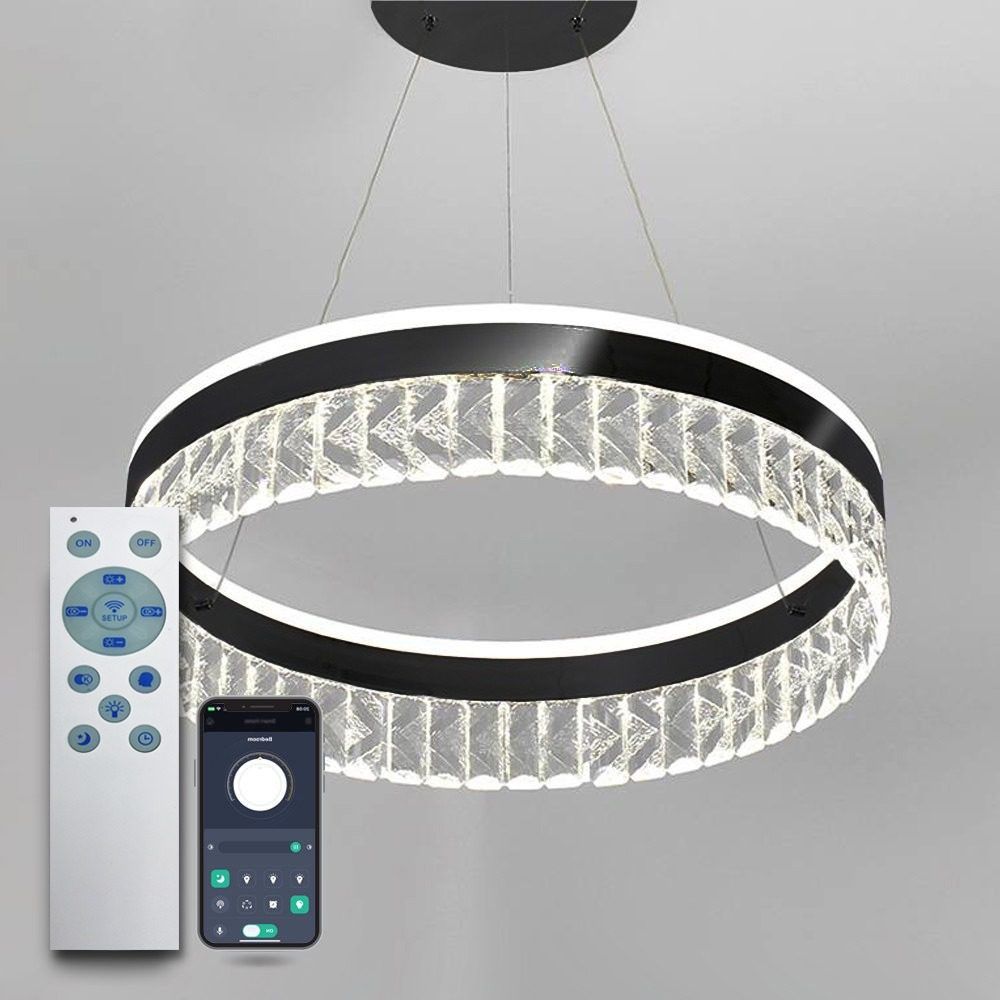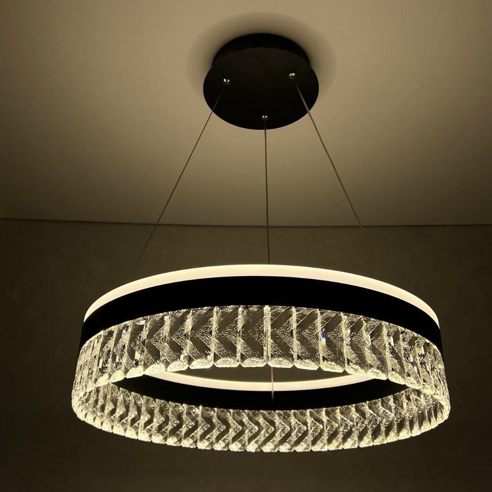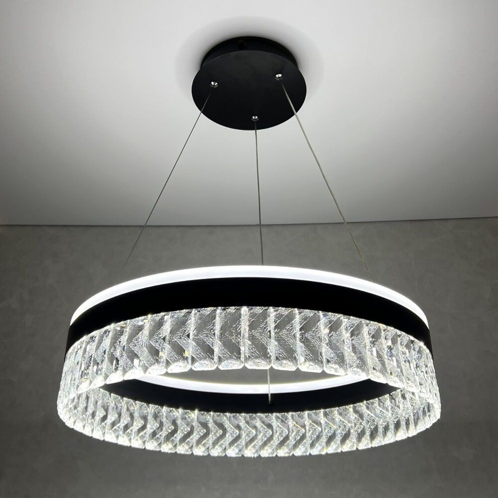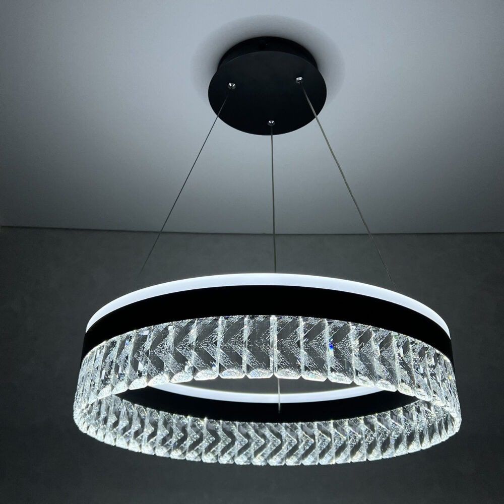 Светодиодный светильник LUMINARIA CARINA 90W – это современный и яркий источник света. Корпус LED светильника CARINA 90W состоит из подвесного кольца, изготовленного из металла с черным покрытием. По периметру кольца расположены хрустальные подвески, придающие дополнительное рассеяние и преломление света. Изящная форма подвесной люстры CARINA 90W позволяет применять ее в помещениях с классическим или современным дизайном.