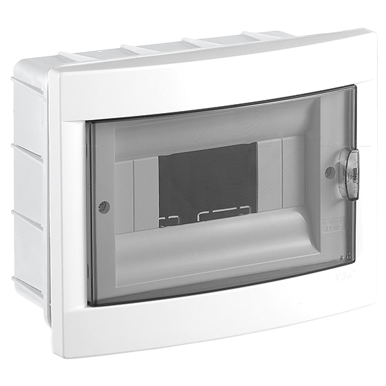 Электрический щиток встраиваемый 8 пластиковый с дверцей. Применяется для установки модульных устройств. Устанавливается встраиваемым способом, в за ранее подготовленную нишу. За счет установки в нишу, электрический щиток встраиваемый имеет минимальную высоту выступания от плоскости установки. Элементы электрического щита встраиваемого изготовлены из само затухающего полистирола, наличие тонированной прозрачной дверцы, дает возможность визуального контроля состояния установленного модульного оборудования. Имеет емкость на 8 мест в 1 ряд.