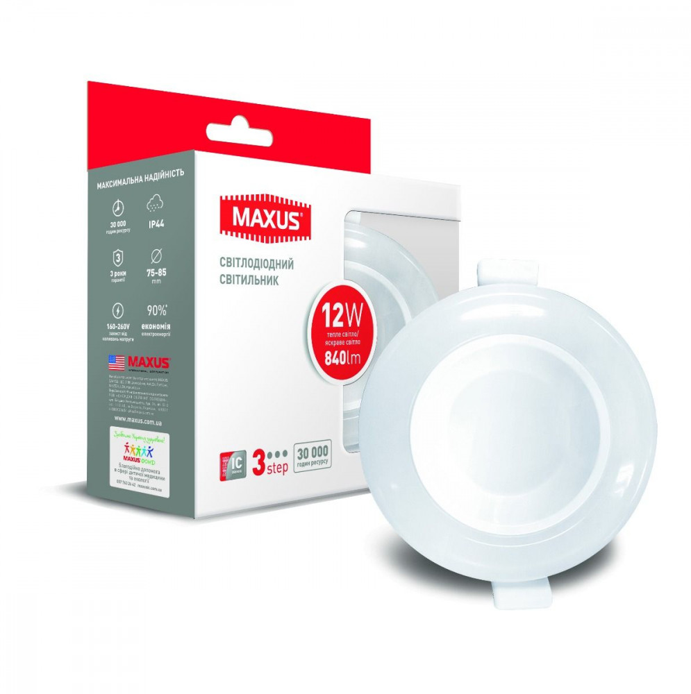 Точечный LED-светильник MAXUS SDL 3-step круглой формы (1-MAX-01-3-SDL-12-C) — это разработка 2018 года. С ним не придется выбирать между рассеянной теплой подсветкой, естественными дневным освещением и прохладным направленным светом. Каждый пользователь этой модели сможет настроить комфортную цветовую температуру и яркость освещения в зависимости от вида деятельности или настроения.