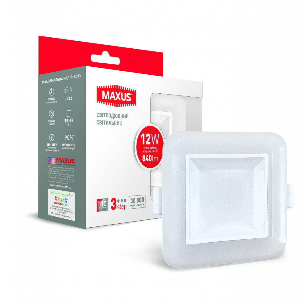 Точечный LED-светильник MAXUS SDL 3-step квадратной формы (1-MAX-01-3-SDL-12-S) — это разработка 2018 года. С ним не придется выбирать между рассеянной теплой подсветкой, естественными дневным освещением и прохладным направленным светом. Каждый пользователь этой модели сможет настроить комфортную цветовую температуру и яркость освещения в зависимости от вида деятельности или настроения.