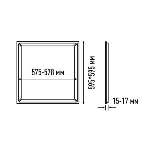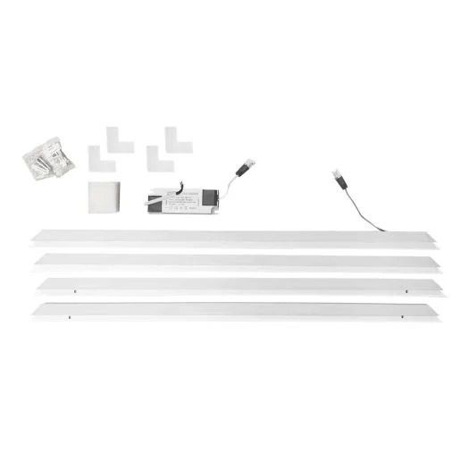 Светильник поставляется в разборной комплектации: LED-рамка (размером 595х595 мм, 15–17 мм толщиной), съемный драйвер, четыре металлических токопроводящих угла и комплект для накладного монтажа. Это упрощает транспортировку, установку и подключение к электросети. Помимо накладного, модель также может устанавливаться встраиваемым или подвесным способом. Надежность светильника подтверждается 2-летней гарантией.